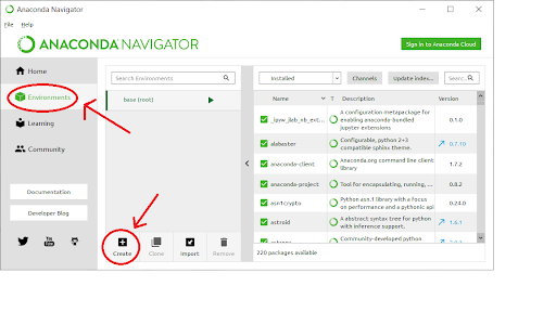 To help manage the Python system we will be using in this course you will need to create an Anaconda environment. To do this, click on the Environments tab in Navigator and then click the Create button at the bottom of the window.